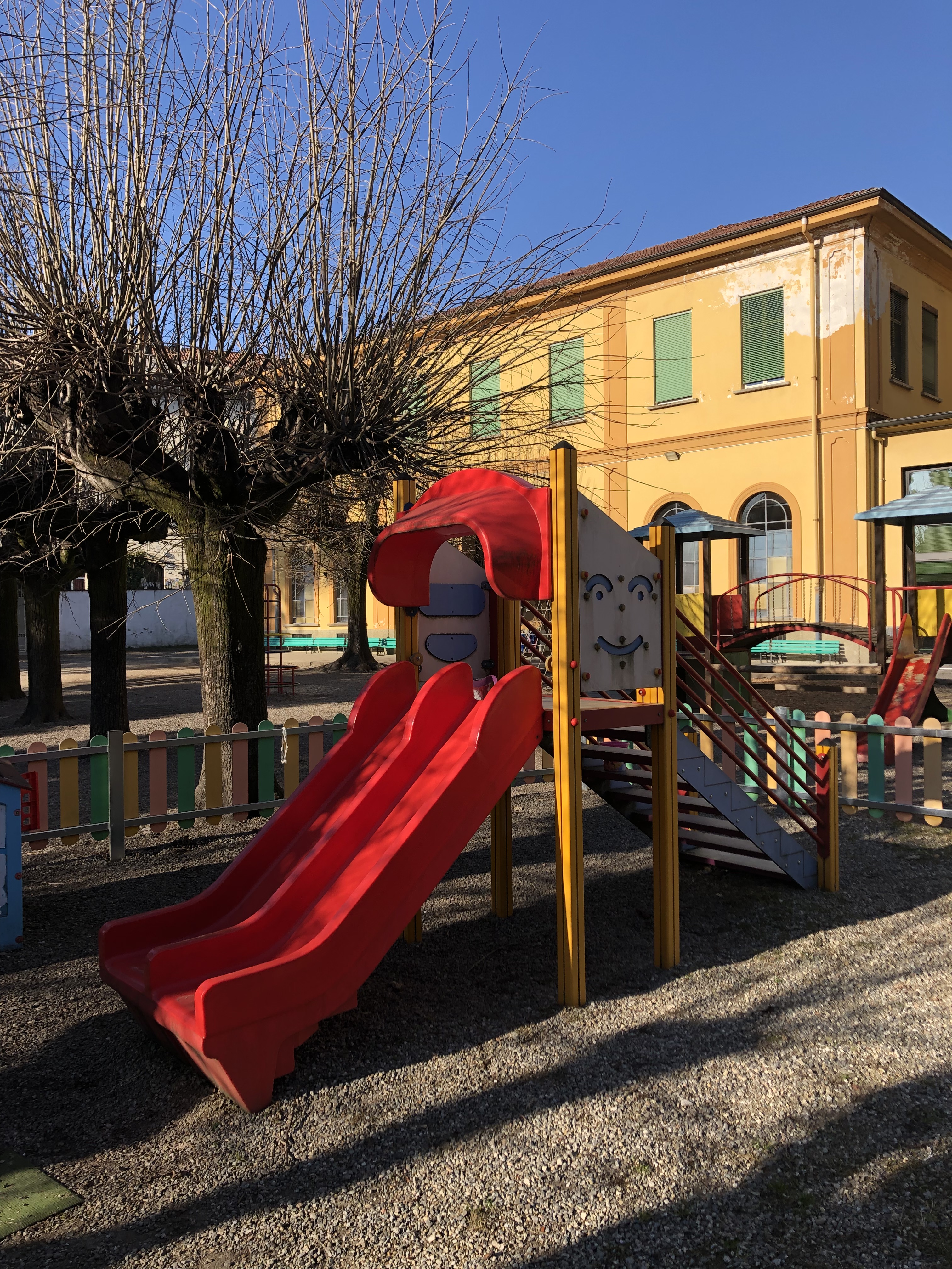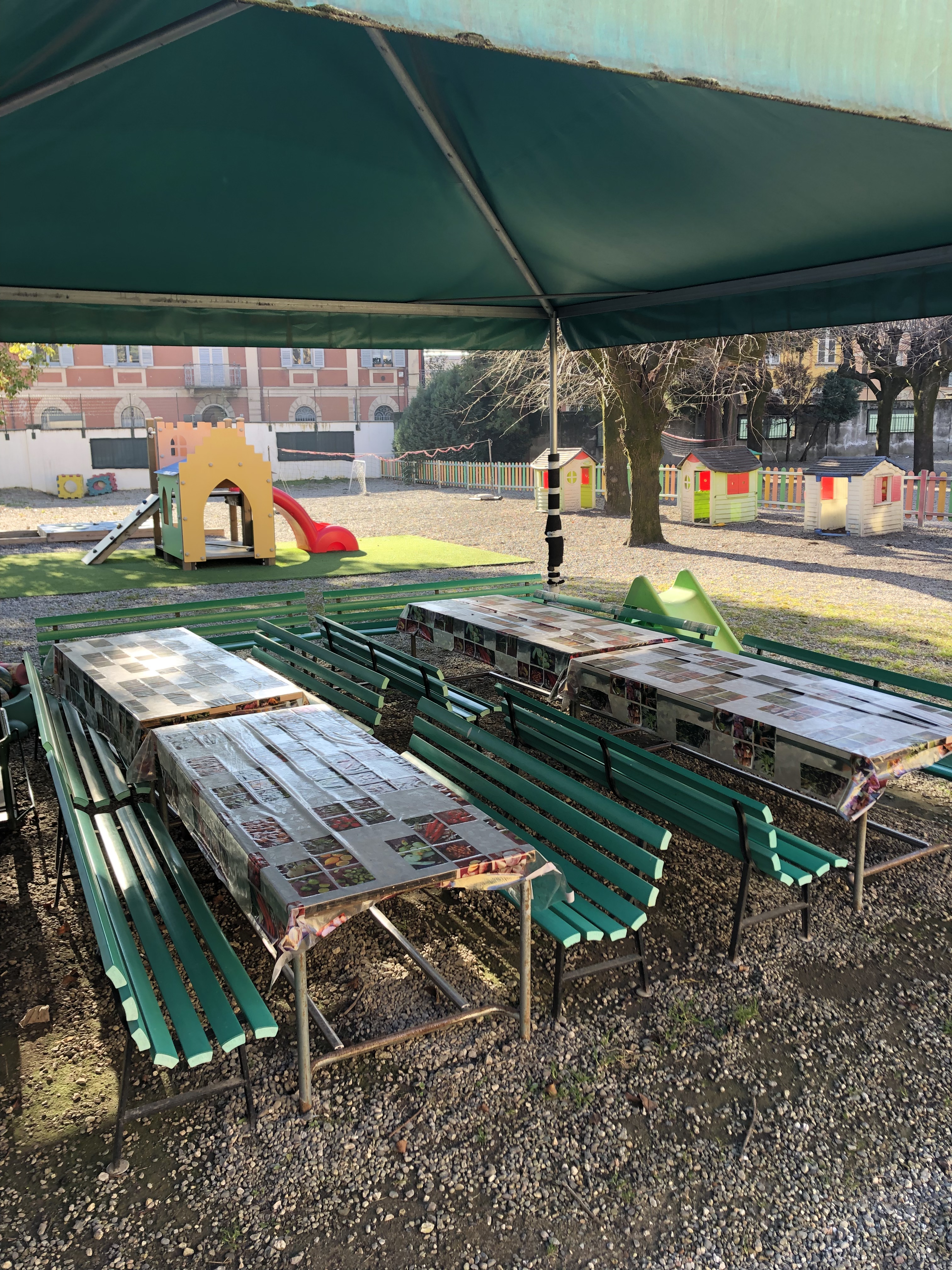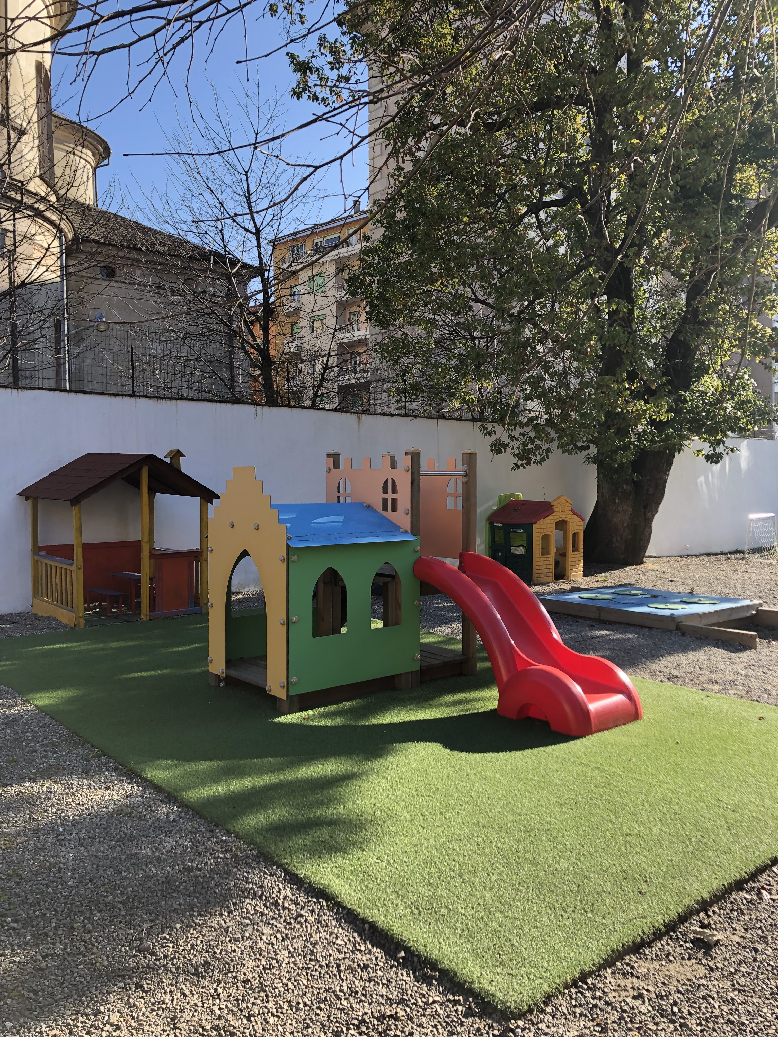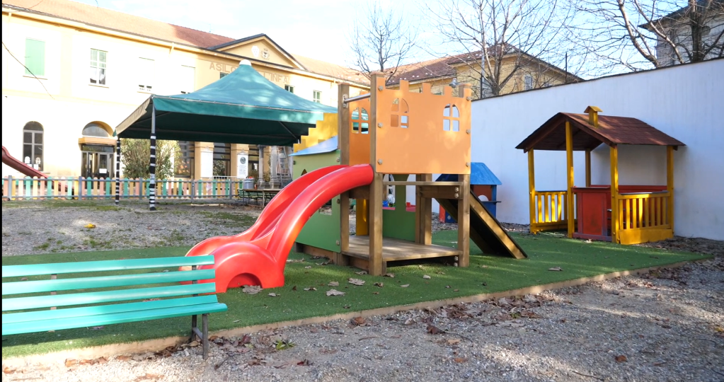 All’esterno trova spazio un ampio e ombreggiato giardino dove i bambini posso giocare, divertirsi e svolgere attività motoria grazie alla presenza di numerose attrezzature.